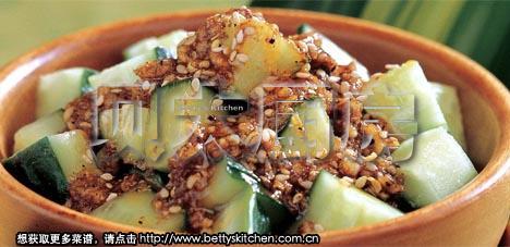 3、将腌好的黄瓜中的水滗出倒掉,上桌前淋上配好的调味汁,撒上炒好的芝麻即可。