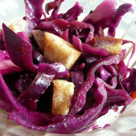 1、紫甘蓝切丝,放到一个干净的容器里里,加白醋和盐适量,腌一周左右。吃之前加白糖,辣椒油,吐司丁拌匀即可
