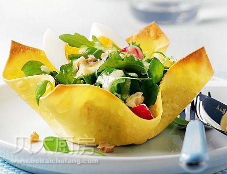 4、芝麻菜用冷水冲洗干净,沥干水分,放入碗中,再加入切好的小萝卜和煮鸡蛋,接着将沙拉放入炸好的小碗中,浇上适量的沙拉汁,上面再撒上核桃仁小块即可。