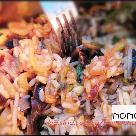 米饭,西红柿,菠菜,豆芽,蘑菇,木耳,洋葱,黄豆芽,胡萝卜,自家种的一点小蒜苗,调料,酱油2汤匙,番茄酱1汤匙,韩国甜辣酱2汤匙,盐,鸡精,香油