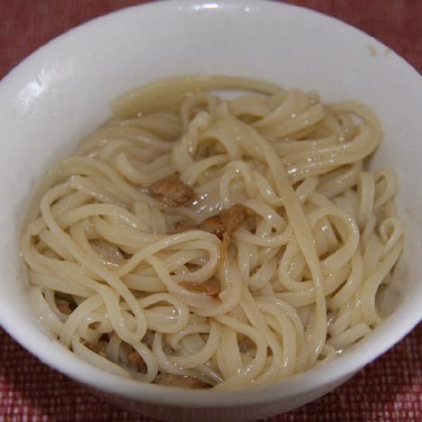 (3)面锅中放水,开锅后煮面条,不要把面条煮烂了,八九成熟就足够了,撑出面条,放入碗中,加入葱油,开洋汁即可。