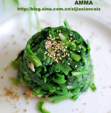 2.菠菜放入盆内,撒上海米,浇入味汁,拌匀即成。