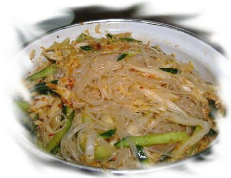 1、把黄瓜切丝、白菜(可以根据自己喜欢配别的菜)也切丝、粉丝煮熟过凉水。