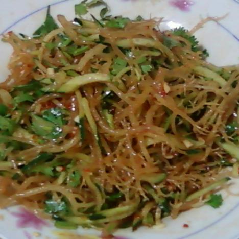 2、香油两小匙、辣椒酱(根据个人口味)、醋3匙、盐一匙、香菜,拌匀即可。