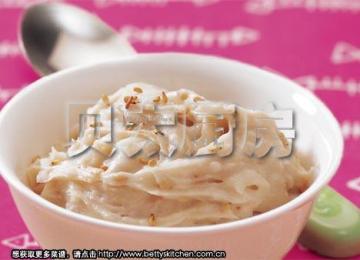 3、在芋泥中加入熟芝麻、白砂糖、生抽和少许开水拌匀即可。