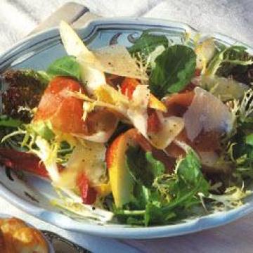 莱姆(青柠)或柠檬1个,做甜点的小梨4个,盐、黑胡椒适量,混合沙拉菜叶85克,意大利熏火腿(巴马火腿)12薄片,共约200克,巴马乳酪1块(75克),纯橄榄油4汤匙