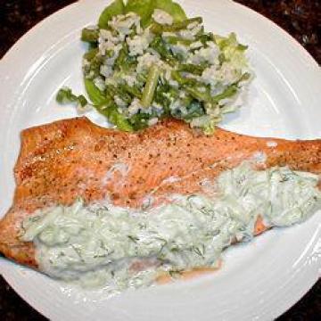 3.用盐和黑胡椒给鱼排入味后放到烤盘上,烤大约8分钟或直至鱼肉变酥。上菜时,将酸奶酱舀到鱼上即可。