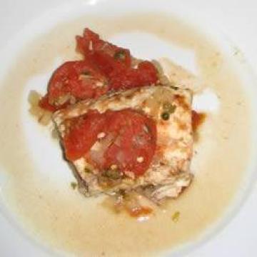 特级初榨橄榄油2汤匙,洋葱1个,切碎,蒜头2个,压碎,碎辣椒干半汤匙,续随子1汤匙,切碎,罐装西红柿块400克,白葡萄酒100毫升,现磨黑胡椒和盐少许,红鯛鱼片4片
