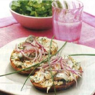2.将做好的调料均匀地涂抹在每一片裸麦面包上。沙丁鱼纵向剖开,放在奶油干酪上,有皮的一面向上。