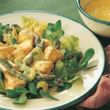 鲑鱼(三文鱼)肉4块,共约675克,橄榄油或葵花籽油1汤匙,芦笋尖200克,芹菜1大棵,混合沙拉叶菜250克,沙拉酱材料:,大芒果2个,细香葱4棵,原味酸乳酪100克,全粒芥酱1茶匙,佩诺茴香酒或茴香烈酒1汤匙,黑胡椒少许