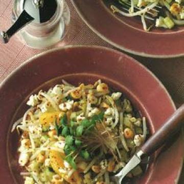 胡瓜(黄瓜)1片,长5厘米,芹菜2根,新鲜豆芽或绿豆芽加紫花苜蓿芽350克,去衣榛子仁100克,甜柳橙1个,希腊羊奶乳酪150克,点缀:,沙拉西洋菜1小篮,沙拉酱材料:,榛子油或核桃油2汤匙,甜柳橙1个,盐、黑胡椒各少许,全粒芥酱1茶匙