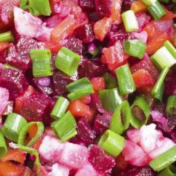 2.加入切碎的青葱和盐进去调味。甜菜根会另其他蔬菜变成红色,如果你不想其他蔬菜被染色,把甜菜根放在一边,淋上沙拉酱后才把甜菜根小心的加入其他蔬菜里。