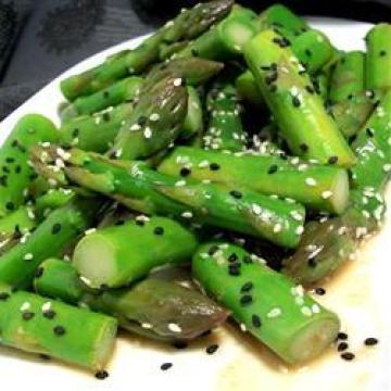 米醋15毫升,红葡萄酒醋5毫升,酱油5毫升,白糖4克,芥末5毫升,花生油30毫升,芝麻油15毫升,新鲜芦笋680克,去老根,切成5厘米长的段,芝麻9克