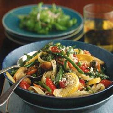 橄榄油2汤匙,李子形西红柿(plumtomato)4个,切块,中等大小的胡萝卜1根,削皮后切片,大蒜2瓣,切片,切片蘑菇(洋菇)75克,低钠零脂肪鸡汤或蔬菜高汤180毫升,芦笋450克,摘去粗茎后切段,烫熟,冷冻豌豆(青豆)450克,室温下解冻,中等大小的黄皮笋瓜(节瓜、翠玉瓜、夏南瓜)1根,切成0.5厘米薄片,剁碎的新鲜罗勒叶10克,磨碎的帕尔马(parmesan)奶酪30克,意大利宽面(fettuccinepasta)225克,盐适量(可选)