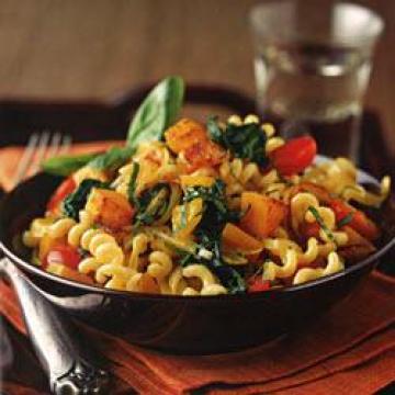 橄榄油2汤匙,大甜洋葱1个,切片,黄甜椒1个,去籽后切小块,白胡桃冬南瓜(butternutsquash)1个(约570克),削皮后去籽,切成2.5厘米见方,盐1/2茶匙,切碎的新鲜罗勒10克,大蒜5瓣,切末,樱桃小西红柿或圣女小西红柿120克,对半切开,嫩菠菜叶170克,低钠零脂肪鸡汤960毫升,意大利螺旋面225克