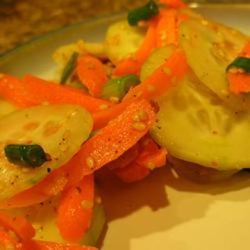 2.用中高火将油在锅里烧热,将芝麻放入,转为中火,炒到芝麻变黄为止,大概5分钟。然后用漏勺将芝麻取出,倒入醋的混合物。再放入青瓜、葱和胡萝卜。然后在冰箱里放上至少5分钟即可。