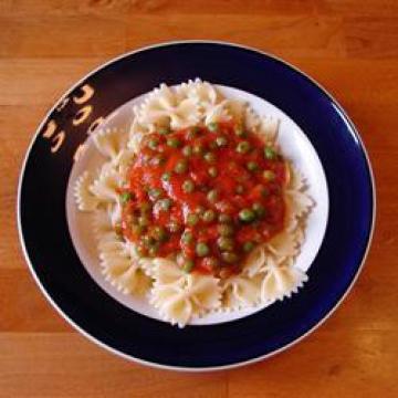 红柿椒2个,切碎,鸡汤100毫升,切碎新鲜牛至1小把,盐1/4茶匙,新鲜黑胡椒粉1/4茶匙,番茄酱1汤匙,意大利黑醋1汤匙,蜂蜜1茶匙,蝴蝶形意粉半包(250克),新鲜豌豆175克,去皮,切碎新鲜欧芹1把