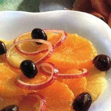 2.量好柳橙汁,拌入等量果味橄榄油及一小撮盐,然后加柠檬汁使沙拉酱味道更浓郁。把水果片排放在4个上菜盘里,用黑橄榄和洋葱圈点缀,浇上沙拉酱即可。