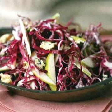 脱脂酸奶油150克,原味脱脂酸奶(酸奶酪)160毫升,苹果醋60毫升,低脂美乃滋(沙律酱)1汤匙,糖4茶匙,红辣椒酱1茶匙,盐1茶匙,碎蓝纹干酪1/3杯(56克),切成丝的红或绿高丽菜(甘蓝)900克,绿苹果4个,切成小块,红甜椒2个,切丝