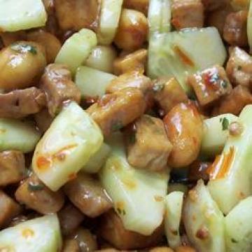 蔬菜油15毫升,蒜15克,切碎,豆腐1盒(390克),沥干后切成方块,花生75克,酱油30毫升,大个黄瓜2根,去皮后切薄片,越南甜辣酱120毫升,青柠汁60毫升,香菜叶1把,切碎