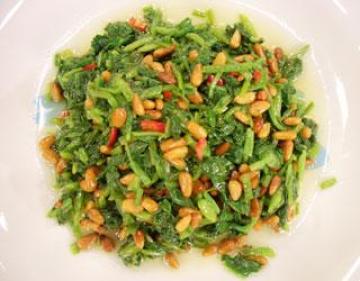 材料:菠菜1斤,松子3大匙,红辣椒末1小匙