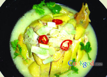 白切清远鸡半只(重约250克)。调料鲜沙姜片50克,葱段、干葱头各20克,骨头汤800克,红椒圈5克,姜蓉15克,豉油20克,鸡油30克,香菜叶5克。