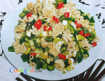 3、将青椒丁、香葱丁、红椒丁放入乌鱼内,加入熟芝麻、精盐、味精、香醋、香油拌匀即成。