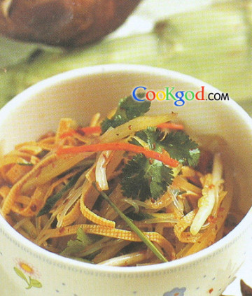 此菜也可称为什锦拌菜,如果只用干豆腐丝、青红萝卜丝、青红辣椒丝就称为拌五丝。