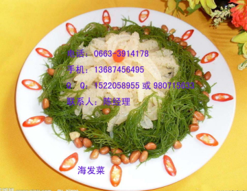 海发菜,学名龙须菜、江蓠,为江蓠科植物江蓠的藻体, 又叫海石花,赤菜, 美国科学家研究发现,海带、紫菜、龙须菜等海洋食品中含有的褐藻氨酸有降压、降脂作用,有人用此治疗高血压病人158例,其中显效86例,且胆固醇下降率为58%,甘油三酯下降率为50.3%。其所含的岩藻多糖具有肝素的活性,可防止红细胞凝集,改善血液黏稠度。 海发菜是一种悄然兴起的时尚海洋珍稀蔬菜,是餐桌上不可多得的真正绿色食品。其营养丰富、鲜嫩脆爽、滑润可口,是一种纯天然,无污染的绿色保健食品和珍稀的海洋蔬菜。海发菜的开发上市,终于让餐桌上绝迹的美味佳肴又回来了,让有八珍团圆、恭禧发财的习俗得到了弘扬……●海发菜食用方法本品食用前用自来水将盐洗去,再用清水浸泡20分钟以上,捞起用沸水烫2-3秒钟后捞起备用(吃火锅可免)。处理后可根据个人口味进行各种烹制。