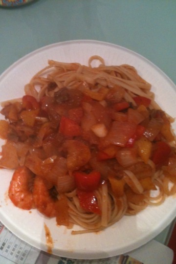 洋葱、彩椒、牛肉末、鲜虾、意式拌面酱(或直接使用蕃茄酱)、麻油或橄榄油