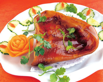 红卤中的金黄色是靠糖色来产生的,千万不能以酱油来代替,加糖色卤制的原料色泽金