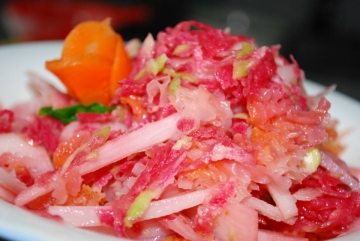 3、以上材料全部装盘,加盐、糖、醋,一起搅拌好。