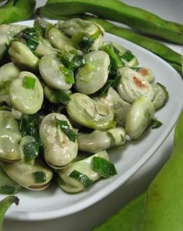 胡豆750克,蒜5瓣,香菜50克,生抽酱油1汤匙,辣椒油1汤匙,糖1茶匙,花椒油1/2汤匙,味精少许,盐