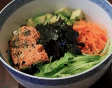三文鱼片2块(每块约170克),烤熟(方法见后)。温室黄瓜1根,胡萝卜1-2根,牛油果2个,生菜叶4-5片,海苔碎适量,米饭适量。