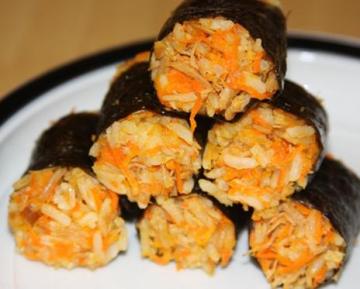 1.锅里放少许油,把胡萝卜丝煸软,然后把米饭拌进去,再拌入肉松,待凉。