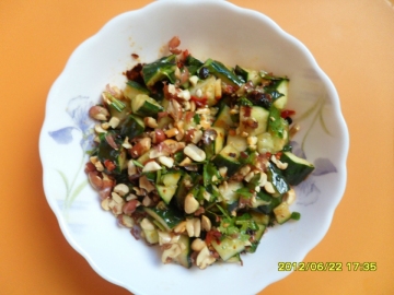 黄瓜一条 葱 蒜 香菜 指天椒 炸花生米 老干妈 陈醋 苹果醋 鸡精