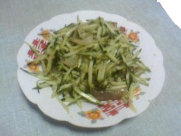 2.海蜇皮与黄瓜切丝,加盐,酱油,香油,味精搅拌几下即可