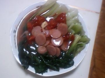 主料:西红柿一个,火腿肉适量,小青菜一小把.