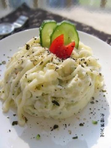 6,可将拌好的沙拉装入容器中,再倒扣在盘子上。用剩余的沙拉酱挤在土豆沙拉上面做装饰,撒上一些揉碎的芝麻和海苔碎,最后用黄瓜片和小西红柿做装饰即可。