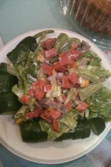 生菜、荷兰黄瓜、玉米火腿肠、蘑菇、杂菜、橄榄油、沙拉酱(香甜味和黄芥茉味)