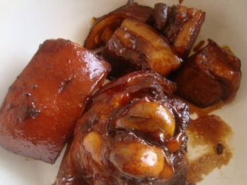 2.重新坐锅,烧热,下几大汤匙猪油,爆蒜(先拍扁)、生姜、干红辣椒,加老抽酱油(味道纯美,上色好)、太古金黄冰糖、料酒、以及自己喜欢的香料(我加有八角、花椒、干椒、茴香、孜然、陈皮、丁香、山奈、……用纱布袋装好扎紧),按自己喜欢的味道来调制,炒出香味后(即炒稠),将蒜捞出,加水煮开,调出风味独特的卤汁。把清洁后的猪蹄等大块放进去。先用大中火煮开,然后用小火卤煮两小时左右或更长时间(咬得动为止)。浸泡三到四小时入味后,切薄片,打点蘸水即可。