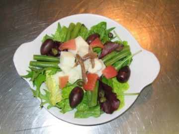 1.番茄(切成丁),豆角(焯熟),土豆丁(煮熟),和罐头装油浸咸凤尾鱼及橄榄(最好是用绿色夹心橄榄,如果没有就用黑橄榄或紫红橄榄代替)。混合在一起,再浇上红酒油醋调料汁