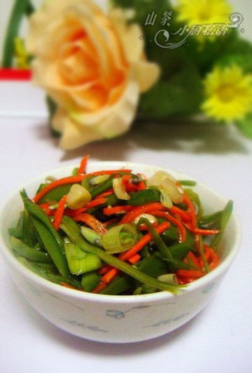 扁豆,胡萝卜,蒜末,葱花,盐,酱油,醋,糖,香油,花椒油