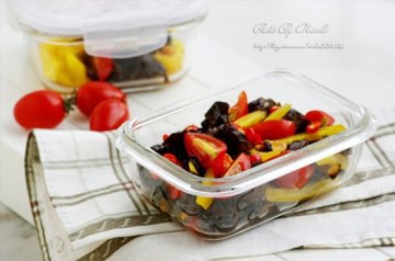 1.圣女果清净后一切4瓣,彩椒切丝,姜切片,小红辣椒切碎