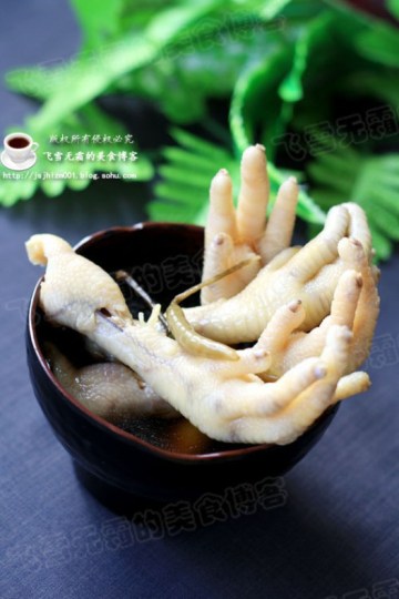 1.鸡爪的外皮去掉后,切去鸡的指甲.洗净后,放在加了八角,花椒和葱段的水里煮熟,取出后把鸡爪凉晾。