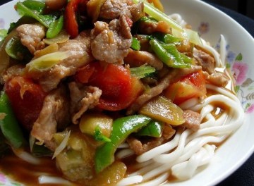 2、起锅,烧热后倒油,7-8成热时放肉片划散,变色后略滴点酱油盛出,放葱蒜生姜末煸炒出香味,放西红柿煸至出红油,放其他蔬菜,翻炒后放盐,放肉片,略闷下~~另只锅子煮面,煮好后将菜浇上去即可。