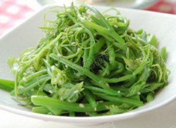 4、把凉透的龙须菜(佛手瓜苗)捞起沥干水,拌入适量盐、芝麻油、鸡粉、熟白芝麻即可。若喜欢辣的,还可加入油辣子、花椒粉等,又是一种口味。