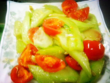 2、先用油拌匀青瓜和小西红柿,再加调料,这样油包住青瓜和西红柿,不容易出水