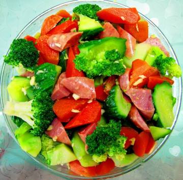 西兰花、胡萝卜、黄瓜、腊肠、蒜、香油、盐、糖、味精、海鲜酱油、醋