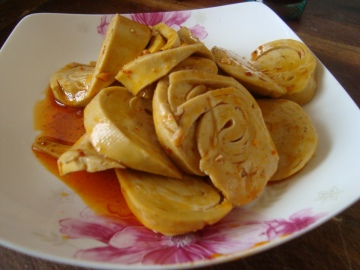 素鸡200克,酱油、花椒粉、辣椒油、盐、味精、白糖各适量